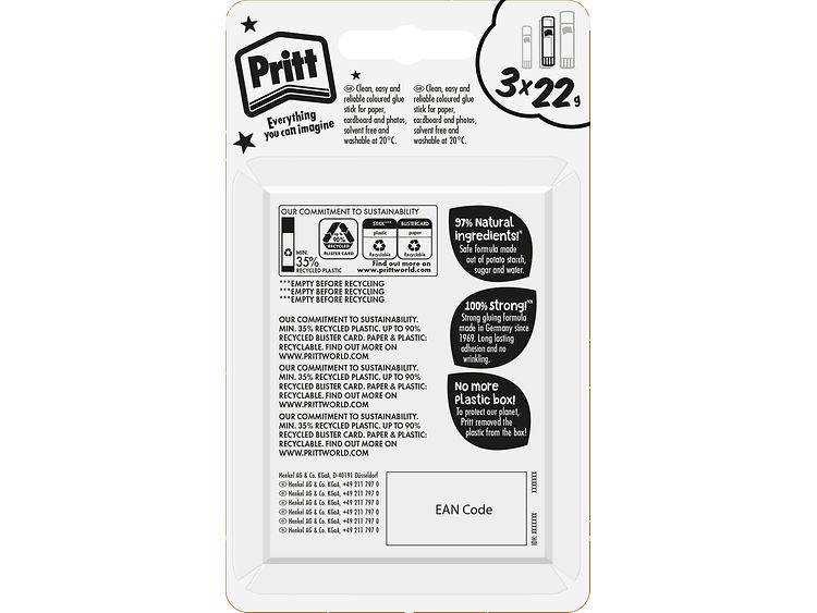 Already in 2022, Henkel introduced plastic-free cardboard blister packaging for its Pritt portfolio to underline its ambitious packaging targets and to further enhance the recyclability of products towards a circular economy – as first manufacturer globally in the category of consumer adhesives.