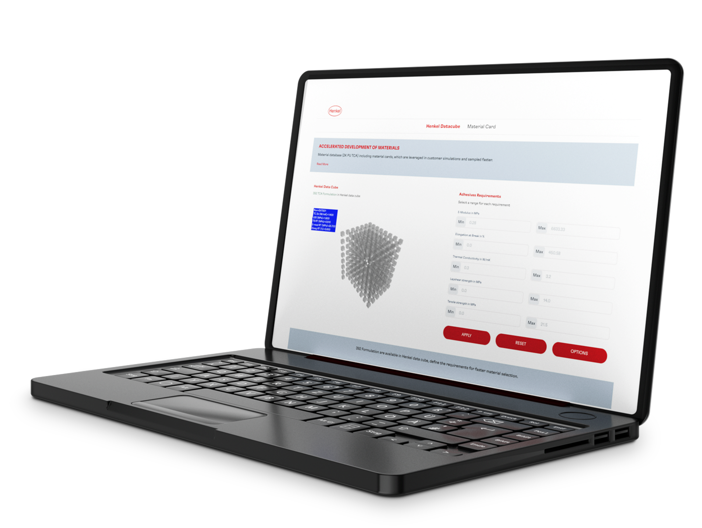 The platform covers a broad range of established Loctite formulations and extends these capabilities further. Powered by a proprietary AI model, it can also generate material data cards for conceptual adhesives, which do not exist as real-world products but can be devised according to engineers’ specific requirements.